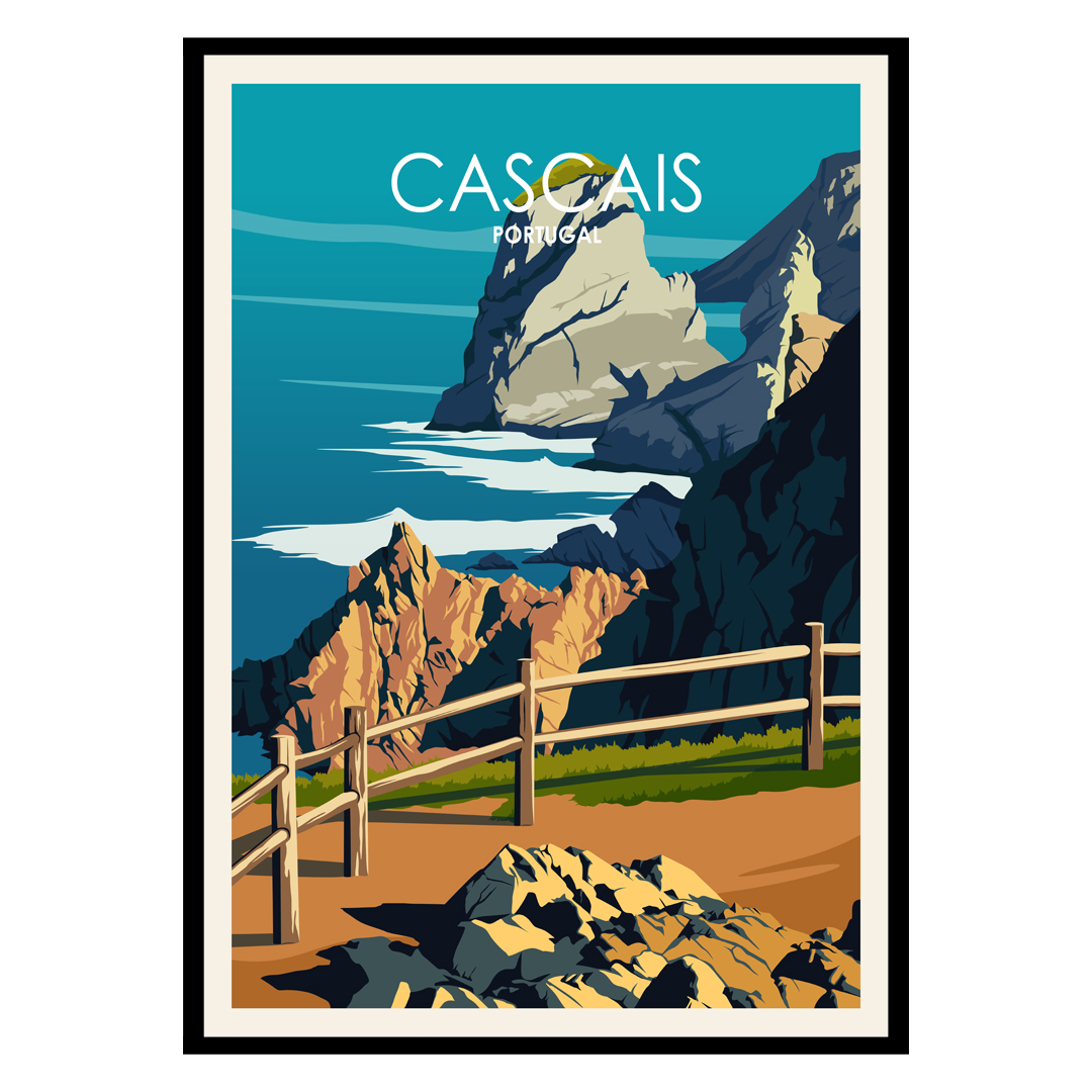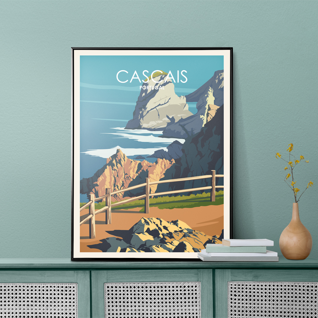 This poster features a captivating view of Cascais, with its shimmering Atlantic waters meeting rugged cliffs, charming pastel-coloured buildings, and a tranquil harbour that hints of days laid back in the sun.